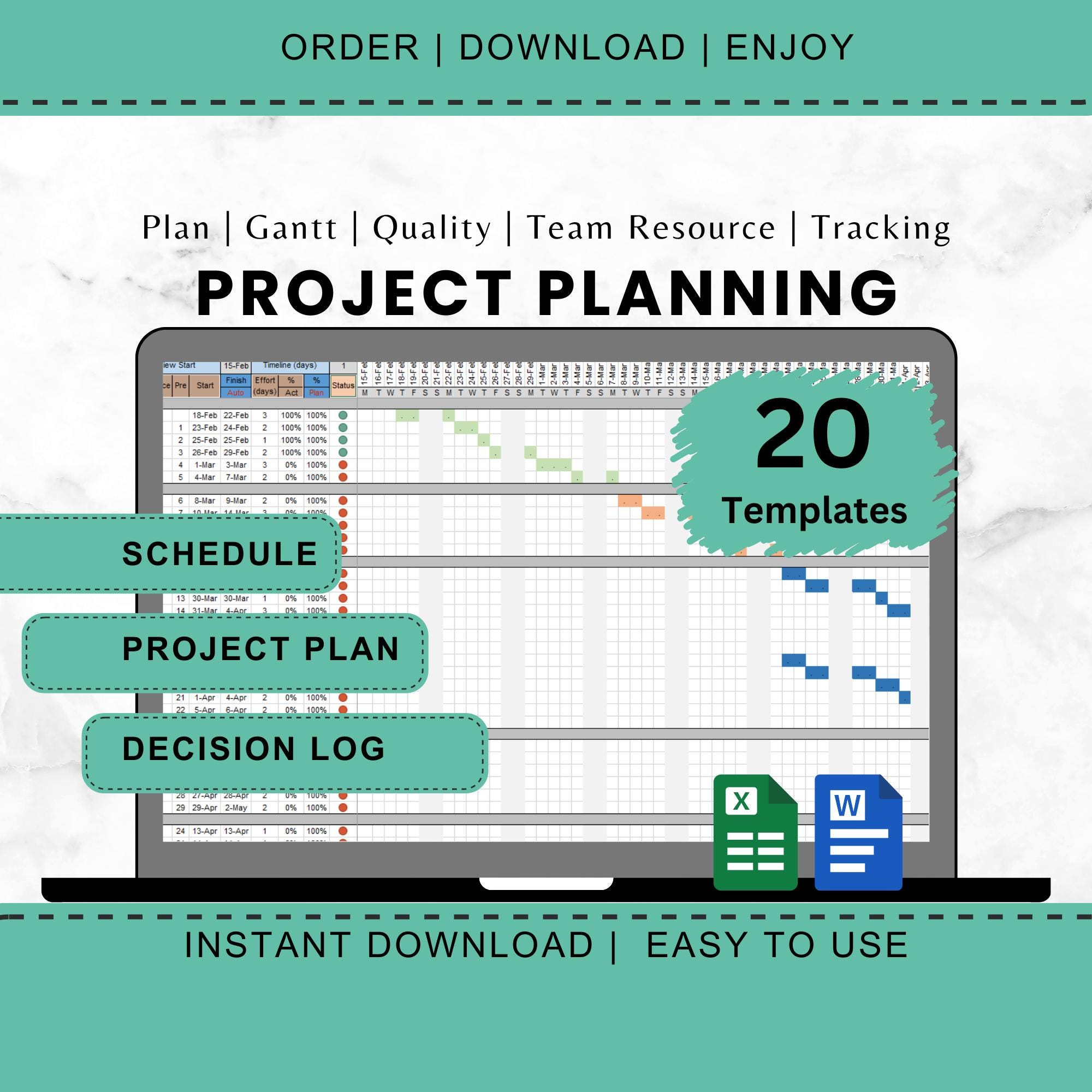 This Project Planner Template provides comprehensive Excel sheets and Word documents for efficient project management. It includes Gantt charts, project timelines, task lists, and a business planner to help manage your team's schedule and track project progress.